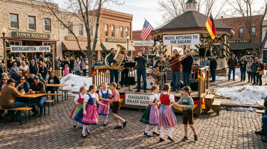 German-American brass bands — once confined to indoor halls during winter — step back outside. Polka rhythms echo through town squares. Children in dirndls and lederhosen rehearse for Maifest performances celebrating the arrival of May.